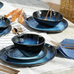 materiał: kamionka kolory: niebieski, czarny liczba elementów: 60 dla 12 osób wykończenie: reaktywne szkliwo do zmywarki do kuchenki mikrofalowej