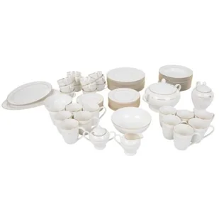 Serwis obiadowo-kawowy, porcelanowy AMBITION Aura Gold to elegancki, klasyczny zestaw, który będzie pasować do każdego wnętrza. Wykonany z wysokiej jakości porcelany New Bone China. Ma on wszystkie potrzebne elementy, żeby stworzyć klimat podczas rodzinnych uroczystości, kolacji świątecznych lub dużych spotkań z przyjaciółmi.