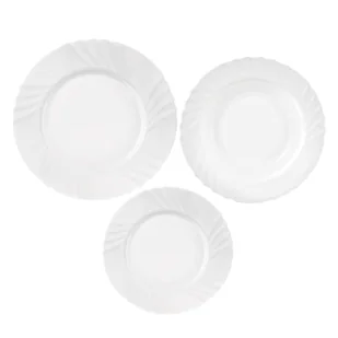 Zestaw talerzy wykonany ze szkła opalowego składa się z następujących naczyń: sześć głębokich talerzy: 23 x 23 cm, wysokość 3,3 cm, sześć talerzy do serwowania: 25,5 x 25,5 cm, wysokość 2,5 cm, sześć talerzy deserowych: 20 x 20 cm, wysokość 1,5 cm.