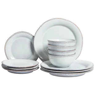 Ręcznie robiony komplet obiadowy dla czterech osób. Dodaj elegancji swojemu stołowi dzięki temu pięknemu, 12-elementowemu zestawowi naczyń kamionkowych. Subtelne zdobienia w formie kropek na brzegach każdego elementu nadają całości ponadczasowy urok, który doskonale uzupełnia każdą aranżację stołu. Ręcznie wykonane naczynia wyróżniają się unikalnym charakterem i delikatnym, szkliwionym wykończeniem, podkreślającym ich rzemieślniczą jakość. Zestaw wykonany z trwałej kamionki zawiera duże talerze na obfite posiłki, mniejsze talerze idealne do przystawek lub deserów oraz wszechstronne miski, które sprawdzą się do zup, sałatek czy płatków śniadaniowych.