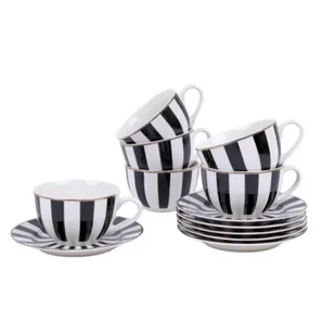 Serwis kawowy Ambition Ribs to kwintesencja stylu haute couture w porcelanowym wydaniu. Kontrastowe pasy w czerni i bieli, uzupełnione subtelnymi złotymi akcentami, tworzą elegancki i ponadczasowy design, który wniesie na stół atmosferę paryskiej wytworności. Zestaw składa się z 12 elementów – 6 filiżanek oraz 6 spodków – idealnych do podawania kawy czy herbaty podczas codziennych chwil relaksu i wyjątkowych spotkań z bliskimi.