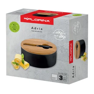 Porcelanowa maselnica Adria w kolorze czarnym ma wymiary 16x6 cm. Wyposażona w bambusową pokrywkę, która chroni zawartość przed wilgocią. Maselnicę można myć w zmywarce. Pokrywkę należy myć tylko ręcznie.