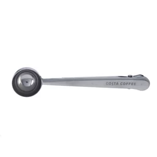 Stalowa łyżka do odmierzania kawy, która jest zakończona klipsem służącym do szczelnego zamknięcia opakowania kawy.