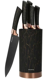 Ich ergonomiczne, antypoślizgowe uchwyty zapewniają wygodę i bezpieczeństwo podczas krojenia. Wykonane ze stali nierdzewnej z powłoką nieprzywierającą, nie pozostawiają metalicznego posmaku na żywności. Powierzchnia noży jest antybakteryjna i odporna na plamy, dzięki czemu zachowują higieniczny wygląd. Całość prezentuje się niezwykle stylowo, nawiązując wyglądem do czarnego marmuru. To must-have dla każdej kuchni, łączące funkcjonalność z estetyką.
