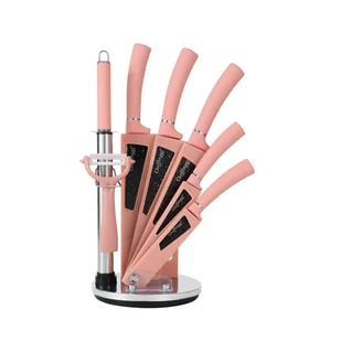 Wytrzymały | Higieniczny | Łatwy do czyszczenia | Antybakteryjny | Można myć w zmywarce |Stojak na noże 8-częściowyUzupełnij swoją kuchnię o ten 8-częściowy zestaw noży. Noże są wykonane z wysokiej jakości stali. Zestaw jest bardzo kompletny z tradycyjnym nożem szefa kuchni, nożem do chleba, ostrzałką do noży i wieloma innymi nożami. Specyfikacja: Kolor: różowyZawartość: