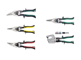 każdy ok. dł. 2,5 cm Waga: zestaw nożyc do blachy: ok. 380 g na sztukę; zestaw do suchej zabudowy: nożyce do blachy: ok. 415 g, szczypce do dziurkowania:
