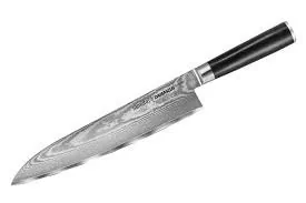 Langeść ostrza 24 cm czyni ten nóż najdłuższym w linii produktów Damascus. Nóż ten był ostrzony z obu stron pod kątem 16-18°, podczas gdy nachylenie pozostawało proste. Główne zalety noży Samura: wykonane z najlepszej japońskiej i szwedzkiej stali, hartowane do 58 - 61 HRC fantastyczna wydajność cięcia dzięki japońskiemu kształtowi ostrza i delikatnemu zwężeniu od czubka kąt ostrzenia 17 stopni (tj.
