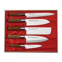 W skład zestawu wchodzi: Satake Masamune Nóż uniwersalny 12 cmSatake Masamune Nóż Nakiri 16 cmSatake Masamune Nóż Deba 16 cmSatake Masamune Nóż Santoku 17 cmSatake Masamune Nóż Sashimi 20,5 cm. . .