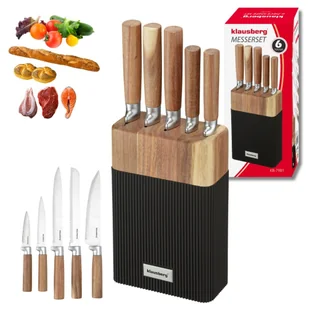 Zestaw noży Klausberg KB-7981 w praktycznym bloku akacjowym — 6 elementów wysokiej jakości do codziennych zadań kuchennych. Solidne wykonanie i wygodny blok zapewniają porządek i szybki dostęp. Idealny wybór dla osób ceniących funkcjonalność i estetykę.