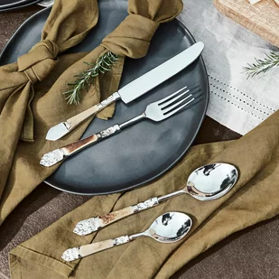 Zestaw sztućców wykonany ze stali nierdzewnej i mosiądzu zachwyca wysokiej jakości wykończeniem. Szczegółowe uchwyty z wstawką z naturalnego rogu bawolego sprawiają, że każdy zestaw jest wyjątkowy. Wstawka zawsze będzie różnić się odcieniem i wzorem. Każdy powinien mieć w swojej kuchni taki wyjątkowy zestaw sztućców. Nie tylko upiększą każdy stół, ale także przyciągną zazdrosne spojrzenia gości.
