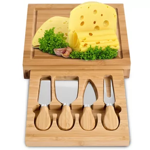 Specyfikacja: Materiał: 100% bambus Antypoślizgowe gumowe nóżki W komplecie: deska + komplet sztućców ze stali nierdzewnej Wymiary deski: 22x19x4,5 cm Deska wyposażona w antypoślizgowe gumowe nóżki Wyposażona w antypoślizgowe gumowe nóżki, deska zapewnia stabilność i pewność podczas używania. Nie musisz się martwić o przesuwanie się deski podczas krojenia czy nakładania serów.