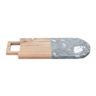 Ta stylowa deska do krojenia przyda się w kuchni, ponieważ jest bardzo wytrzymała i twarda. Połowa deski do krojenia wykonana jest z drewna akacjowego, a druga połowa z czarnego marmuru. Posiada uchwyt, który ułatwia stabilne trzymanie deski do krojenia lub używanie jej jako półmiska do serwowania.