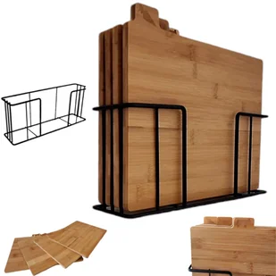 ZESTAW 4 BABUSOWYCH DESEK DO KROJENIA I SERWOWANIA + STOJAK DESKI DO KROJENIA DREWNIANE BAMBUSOWE ZESTAW 5 ELEMENTÓW Ekologiczny zestaw 4 desek. Deski wykona...