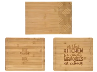 Opis produktu Z bambusa z certyfikatem Fsc® Z dekoracyjnym wzorem – idealna również do serwowania Jakość przyjazna dla noży Styl B & C: Dookoła rynienka na sok Cechy produktu Materiał: bambus Wymiary: wzór geometryczny: ok. dł. 35 x szer. 25 x wys. 1,5 cm home sweet home & napis: