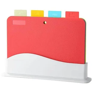 Zestaw czterech kolorowych desek do krojenia wraz z dedykowanym stojakiem. Rozróżnienie kolorystyczne ułatwia ich dopasowanie do określonego rodzaju żywności...