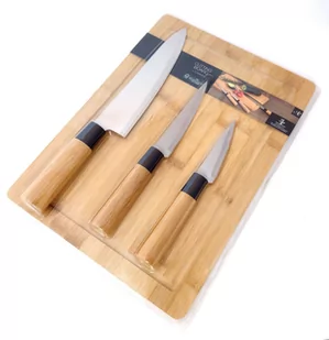 Wysokiej jakości deska bambusowa 35 x 25 cm. 3 noże w zestawie: ostrze 20 cm, ostrze 13 cm, ostrze 8 cm.