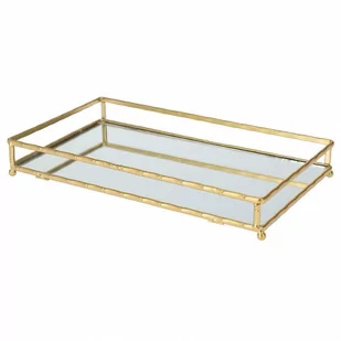 PROSTOKĄTNA - Prostokątna taca lustrzana o wymiarach 30,5 x 17 cm i wysokości 4 cm. Świetnie sprawdzi się jako taca pod świece oraz kompozycje dekoracyjne. Usadowiona na czterech nóżkach w postaci ozdobnych kulek. METALOWA - Wykonana z metalu w kolorze złotym oraz tafli lustra. Łatwa w przenoszeniu.