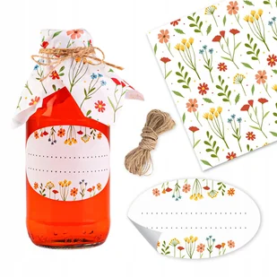 Zestaw: 10x etykiety owalne samoprzylepne 55x90 mm na domowe przetwory w motywie kwiatowym 10x papierowe serwetki / kapturki na słoiki, butelki w motywie kwi...