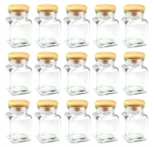 15x Słoiki na przyprawy 150 ml z eleganckim drewnianym zamknięciem Wymiary wysokość z korkiem - 9,8 cm szerokość podstawy - 5,6 x 5,6 cm podstawa - kwadratow...