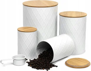 Winter Shore Zestaw 4 puszek kuchennych z białego metalu – Pudełka na kawę ze stali ocynkowanej – Hermetyczne bambusowe pokrywki i metalowa łyżka – Ciastka, ...