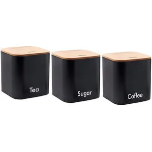 Na pojemnikach napisy Sugar, Coffee, Tea.
