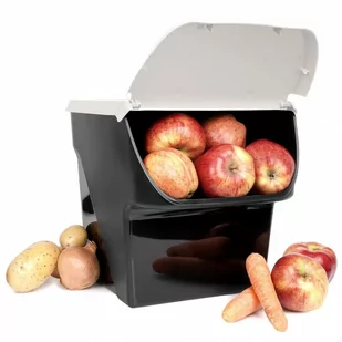 DO PRZECHOWYWANIA - Praktyczny pojemnik do przechowywaniu cebuli, ziemniaków, czosnku, itp. oraz akcesoriów. Pojemnik ma wymiary 34 x 26 x 27,5 cm i pojemność 13 litrów. WYTRZYMAŁY - Wykonany z wysokiej jakości tworzywa w kolorze czarnym a pokrywka w kolorze popielatym. Przeznaczony do kontaktu z żywnością.