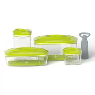 Zestaw czterech pojemników próżniowych jest uniwersalną propozycją, która sprawdzi się w każdej kuchni. Znacznie ułatwia marynowanie mięsa i ryb oraz przechowywanie wszystkich typów pokarmów, w tym wędlin, warzyw i owoców, kawy czy serów. Wszystkie pojemniki wykonane są z trwałego tworzywa sztucznego i zaopatrzone w uszczelki zapewniające maksymalną szczelność.