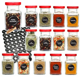 Słoiki na przyprawy 150 ml x14 szt z czerwoną zakrętką 90 etykiet czerpak
