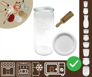 Słoik żaroodporny WECK Materiał: szkło Kolor: transparentny Pojemność słoika: 1040 ml Wysokość słoika: 21,9 cm Rodzaj wieczka: