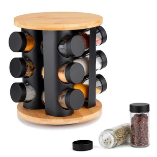 Stojak obrotowy: Stojak posiada obrotową podstawę, co pozwala na łatwe i szybkie odnalezienie odpowiedniej przyprawy. Dzięki obrotowej funkcji dostęp do pojemników jest wygodny z każdej strony.