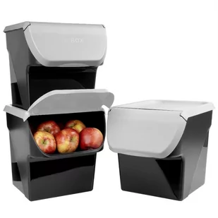 ✔️ DO PRZECHOWYWANIA - Praktyczny zestaw trzech pojemników do przechowywania cebuli, ziemniaków, czosnku oraz akcesoriów. Każdy pojemnik ma wymiary 34 x 26 x 27,5 cm i pojemność 13 litrów. ✔️ WYTRZYMAŁE - Wykonane z wysokiej jakości tworzywa w kolorze czarnym a pokrywki w kolorze szarym. Przeznaczone do kontaktu z żywnością. Nadają się do zamrażalki (do -25°C) oraz do mycia w zmywarce do naczyń.