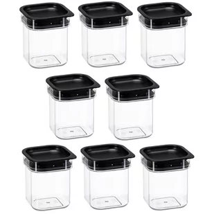 Szerokość: 10,5 cm Wysokość: 11,6 cm Długość: 10,5cm Pojemność: 0,6 L Kolor: transparentny/czarna pokrywka Ilość pojemników w zestawie: