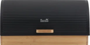Czarny chlebak z serii Danubio firmy Berretti. Korpus chlebaka wykonano z prasowanej trawy bambusowej. Pokrywę utworzono z prążkowanej stali, malowanej proszkowo na kolor czarny.