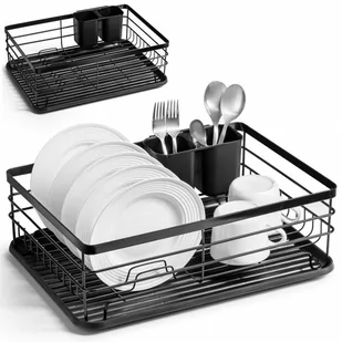 NIEZBĘDNY W KUCHNI - Ociekacz do naczyń o wymiarach 40,5 x 29,5 x 14,5 cm. Ułatwi suszenie umytych ręcznie sztućców i talerzy oraz ochroni blat kuchenny. SOLIDNE WYKONANIE - Suszarka wykonana z nierdzewnego metalu w kolorze czarnym. Wyposażona w wyjmowaną tacę z wysokiej jakości tworzywa w kolorze czarnym. UNIWERSALNY STYL - Minimalistyczny styl i stonowane kolory to cechy charakterystyczne tego produktu, dzięki którym wpasuje się ona do każdego wnętrza, tworząc z nim spójną całość.