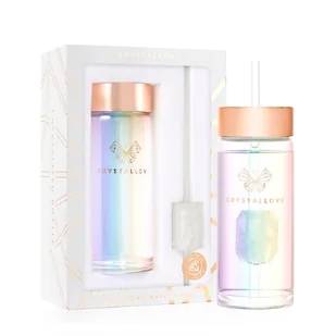 CRYSTALLOVE SZKLANA BUTELKA NA WODĘ Z KRYSZTAŁEM GÓRSKIM I SŁOMKĄ 400ml - hologramOdkryj wyjątkową harmonię ciała, umysłu i stylu dzięki naszej szklanej butelce na wodę z kryształem górskim. Butelka jest nie tylko funkcjonalna ale także łączy elegancję z właściwościami naturalnego kryształu górskiego. To coś więcej niż butelka – to Twój codzienny rytuał zdrowia i dobrego samopoczucia!Butelka wykonana jest z najwyższej jakości materiałów takich jak szkło borokrzemowe oraz stal nierdzewna klasy spożywczej. Szkło borokrzemowe uważane jest za najzdrowszy, wolny od toksyn materiał. Dodatkowo, szkło pokryte jest hologramową poświatą dzięki czemu przepięknie mieni się kolorami tęczy.