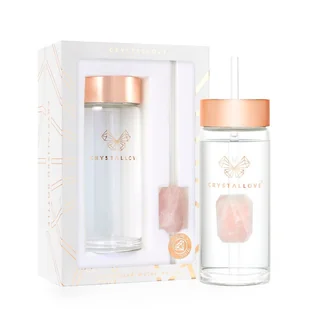 CRYSTALLOVE SZKLANA BUTELKA NA WODĘ Z KWARCEM RÓŻOWYM I SŁOMKĄ 400mlOdkryj wyjątkową harmonię ciała, umysłu i stylu dzięki naszej szklanej butelce na wodę z kwarcem różowym. Butelka jest nie tylko funkcjonalna ale także łączy elegancję z właściwościami naturalnego kwarcu różowego. To coś więcej niż butelka – to Twój codzienny rytuał zdrowia i dobrego samopoczucia!Butelka wykonana jest z najwyższej jakości materiałów takich jak szkło borokrzemowe oraz stal nierdzewna klasy spożywczej. Szkło borokrzemowe uważane jest za najzdrowszy, wolny od toksyn materiał. Do zestawu dołączona jest szklana słomka oraz naturalny kwarc różowy, który możesz nałożyć na słomkę.