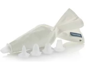 Tupperware Dekorator Tuba Zestaw zawiera worek do dekorowania, pięć nakładek i wkręcany adapter, do którego mocowane są nakładki. Worek jest łatwy do napełniania i czyszczenia. Wszystkie nakładki są przezroczyste, więc można łatwo zobaczyć i skontrolować masę, którą dekorujemy ciasto. Każda zakładka ma inny kształt: otwarta gwiazdka, zamknięta gwiazdka, cienka nitka, muszelka i rurka.