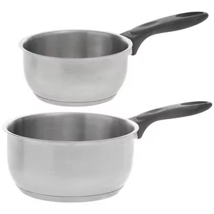 Prezentowany komplet garnków do sosów zawiera 2 sztuki w dwóch rozmiarach: O 14 / O 18 cm. Każdy z garnków został wyposażony w długą, bakelitową rączkę, która pozwala z łatwością przenosić podgrzaną zawartość i swobodnie rozlewać ją do innych naczyń. Tworzywo to neutralizuje działanie wysokiej temperatury na dłoń. Misa pokryta jest natomiast nieprzywierającą powłoką, która zapobiega przywieraniu i znakomicie rozprowadza temperaturę. Zestaw jest przeznaczony do użytkowania na wszystkich rodzajach kuchenek.