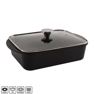 wykonano ze stopu aluminium pokrytego wysokiej jakości powierzchnią nieprzywierającą PFLUON GRANIT solidne uchwyty zapewniają bezpieczną obsługę naczynie jest kompatybilne ze wszystkimi rodzajami płyt, w tym indukcyjnymi przeznaczona jest do pieczenia i zapiekania w piekarniku, z pokrywką do 200°C aluminiowy korpus brytfanny do pieczenia jest doskonałym przewodnikiem ciepła, dzięki czemu można wcześniej wyłączyć piekarnik i pozwolić na dopieczenie pokarmu można myć w zmywarce, jednak ze względu na agresywne środki czyszczące może dojść do lekkiego utlenienia (warunek ten nie wpływa na proces gotowania, nie jest szkodliwy dla zdrowia i nie stanowi powodu do reklamacji). Zalecamy: podczas intensywnego ogrzewania użyj rękawic. Jeśli brytfannę umieścisz na kuchence, wybierz rozmiar palnika proporcjonalnie do średnicy dna i korzystaj z drewnianych, silikonowych lub nylonowych przyborów.