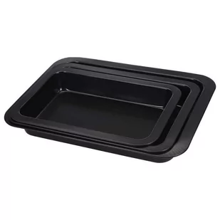 Zestaw trzech prostokątnych blach do pieczenia o różnych wielkościach. Sprawdzą się przy pieczeniu mięs, ciast, zapiekanek itp.