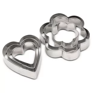 Zestaw stalowych wykrawaczy cukierniczych do przygotowywania ciastek oraz pierników. W zestawie 6 sztuk wykrawaczy w kształcie kwiatka i serca. Każde w 3 rozmiarach.