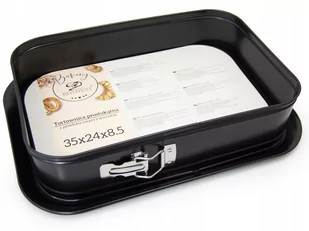MEYERHOFF Tortownica prostokątna 35x24x8,5cm czarna forma do ciasta PRODUKT NOWY, ORYGINALNIE ZAPAKOWANY ! TANIEJ NIE ZNAJDZIESZ !!! Prostokątna tortownica 35x24x8,5cm czarna forma do ciasta marki MEYERHOFF Tortownica z fakturowanym dnem została wykonana z wysokiej jakości stali węglowej pokrytej powłoką non-stick, która uniemożliwia przywieranie ciasta. Powłoka ze stali węglowej zapewnia równomierne nagrzewanie się blachy. Boki zapinane na klamrę, co daje możliwość bezproblemowego wyjęcie ciasta, a wyciągane, powiększone dno umożliwi podanie ciasta bezpośrednio na niej. Praktyczny i niezbędny produkt, który z pewnością się przyda w każdej kuchni. Szczególnie dla osób ceniących tradycyjne, domowe wypieki.