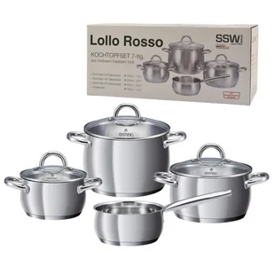 Garnki 7 elementów nierdzewne SSW Lollo Rosso 400093 Komplet garnków ze stali nierdzewnej 18/8. Garnki posiadają szklane pokrywki z chromowaną krawędzią, uchwyty ze stali nierdzewnej i otwór parowy. Powierzchnia naczyń na zewnątrz z satynowym wykończeniem z wydrożonymi uchwytami. Wnętrze naczyń jest satynowe. Posiadają także termiczne wielowarstwowe dno zapewniające szybkie pochłanianie i gromadzenie ciepła.