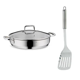 Doskonała Specyfikacja i Wygodne UżytkowanieNaczynie Flavoria o wymiarach 28 x 6 cm (śr. x wys.) zostało zaprojektowane z myślą o najwyższym komforcie. Posiada krawędź zapobiegającą kapaniu oraz wygodne uchwyty odlewane ze stali. W komplecie znajduje się szklana pokrywka z otworem do uwalniania pary, co zwiększa kontrolę nad procesem gotowania. Odporność temperaturowa korpusu do 220°C (z pokrywką do 180°C) pozwala na wszechstronne zastosowanie. Idealne do codziennego użytku i efektownego podawania na stół. Łopatka kuchenna Rondo (33,5 x 8 cm) to niezastąpione akcesorium, również wykonane z polerowanej stali nierdzewnej, z otworem do zawieszania.