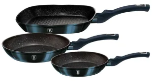 Zestaw zawiera: Patelnia Ø20 x 4. 0cm Patelnia Ø24 x 4. 5cm Patelnia grillowa 28 x 28 x 4,5cm Cechy naczyń: Potrójna powłoka granitowa anty-przywierająca Materiał: