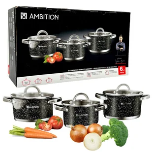 KOMPLET GARNKÓW AMBITION 6EL. VARIG CZARNE Zestaw garnków - 6 elementów Linia garnków Ambition Varig wykonanych z najwyższej jakości stali nierdzewnej. Wykorzystana stal składa się z najwyższej jakości stopu, co gwarantuje odporność na korozję i wytrzymałość. Posiada wysokie właściwości termiczne, które skracają czas gotowania i przez długi okres utrzymują ciepło. Grube dno zapobiega przypalaniu i przywieraniu potraw.