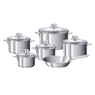 Producent: SSW Berlin Model: Peperoni Materiał: stal nierdzewna / szkło Ilość w zestawie: 11 elementów: 5 garnków z pokrywami + patelnia