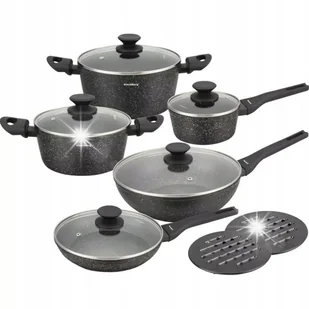 - garnek z pokrywką ⌀24 x 11 cm - 4,4l - garnek z pokrywką ⌀20 x 9 cm - 2,4l - rondelek z pokrywką ⌀16 x 7 cm - 1,2l - patelnia głęboka wok z pokrywą ⌀28 x 8 cm - 3,9l - patelnia z pokrywą ⌀24 x 4,5 cm - 1,6l - podstawki bakelitowe pod gorące garnki - 2 szt.