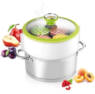 Tescoma Zestaw do pasteryzacji, gotowania na parze Doskonały do łatwej pasteryzacji oraz sterylizacji potraw na parze. Odpowiedni do wszystkich garnków o średnicy 24 cm. Szklana pokrywka została wyposażona w dokładny termometr ułatwiający kontrolę temperatury oraz słoików podczas pasteryzacji. Podkładka do gotowania na parze uchroni słoiki przed wysoką temperaturą dna garnka, uniwersalna nakładka jest doskonała do pasteryzacji wysokich słoików oraz słoików ustawionych jeden na drugim. Instrukcja jest częścią opakowania.