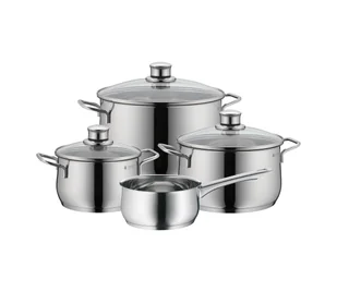 Ciesz się wygodą podczas gotowania dzięki inteligentnym i eleganckim naczyniom, które gwarantują sukces w kuchni przy minimalnym wysiłku. Wysoki garnek jest idealny do przygotowywania składników wymagających dużej ilości wody, takich jak makaron, ziemniaki czy warzywa. W zestawie znajdują się również mniejsze garnki, doskonałe do przygotowywania małych porcji i podgrzewania potraw. Delikatnie wypukły kształt prezentuje się stylowo, a przez szklane pokrywki można obserwować cały proces gotowania. Szeroki rant ułatwia nalewanie bez rozlewania.